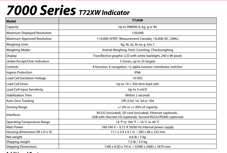Thông số kỹ thuật đầu cân điện tử Ohaus T72XW