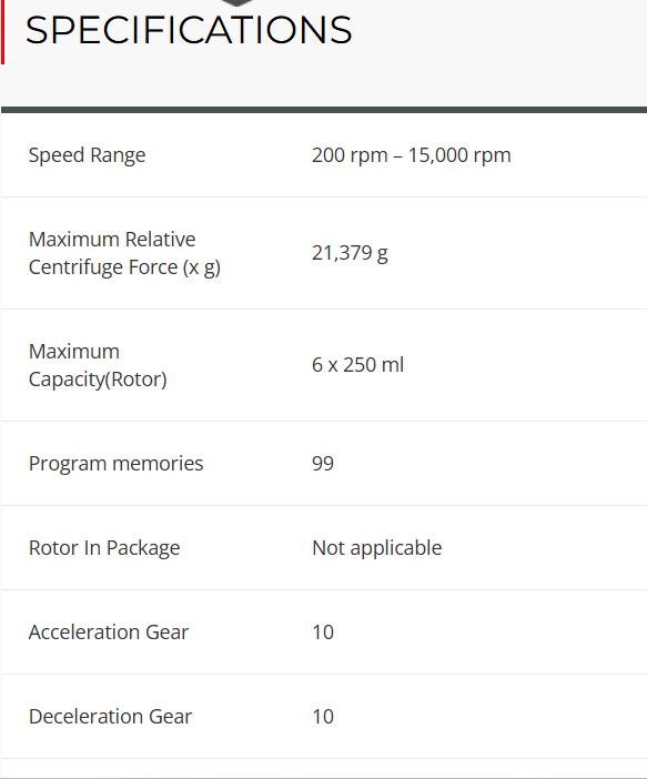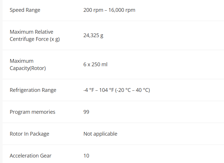 Angle 4 x 85ml RB ID Hi; Angle 6 x 250 ml FB ID; Angle 44 x 1.5 / 2.0 ml ID V2; Angle 30 x 15 ml RB/FA ID; Angle 6 x 50 ml RB ID Hi; Rotor Angle 24x1.5/2.0ml ID BIOSEALS V1; Angle 10 x 50 ml FA ID; Angle 20 x 10 ml RB ID Hi; Angle 6 x 85 ml RB ID; Swing out 16 x 50 ml ID; Swing out 4 x 250 ml ID; Swing out 2 x 3MTP ID |